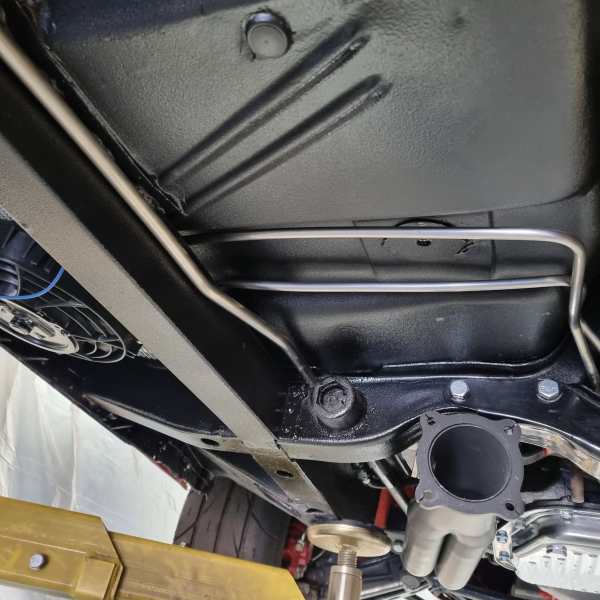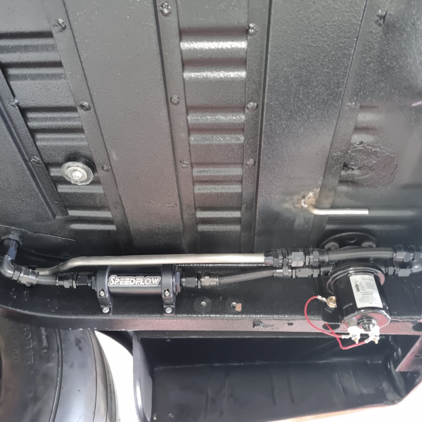 To get all of this working in this Chrysler we run an electric pump under the vehicle and have fitted custom made stainless steel lines to the motor and returning to the tank. That way ensuring that 750cfm Holley Carburettor is supplied with the correct pressure of fuel at all times.